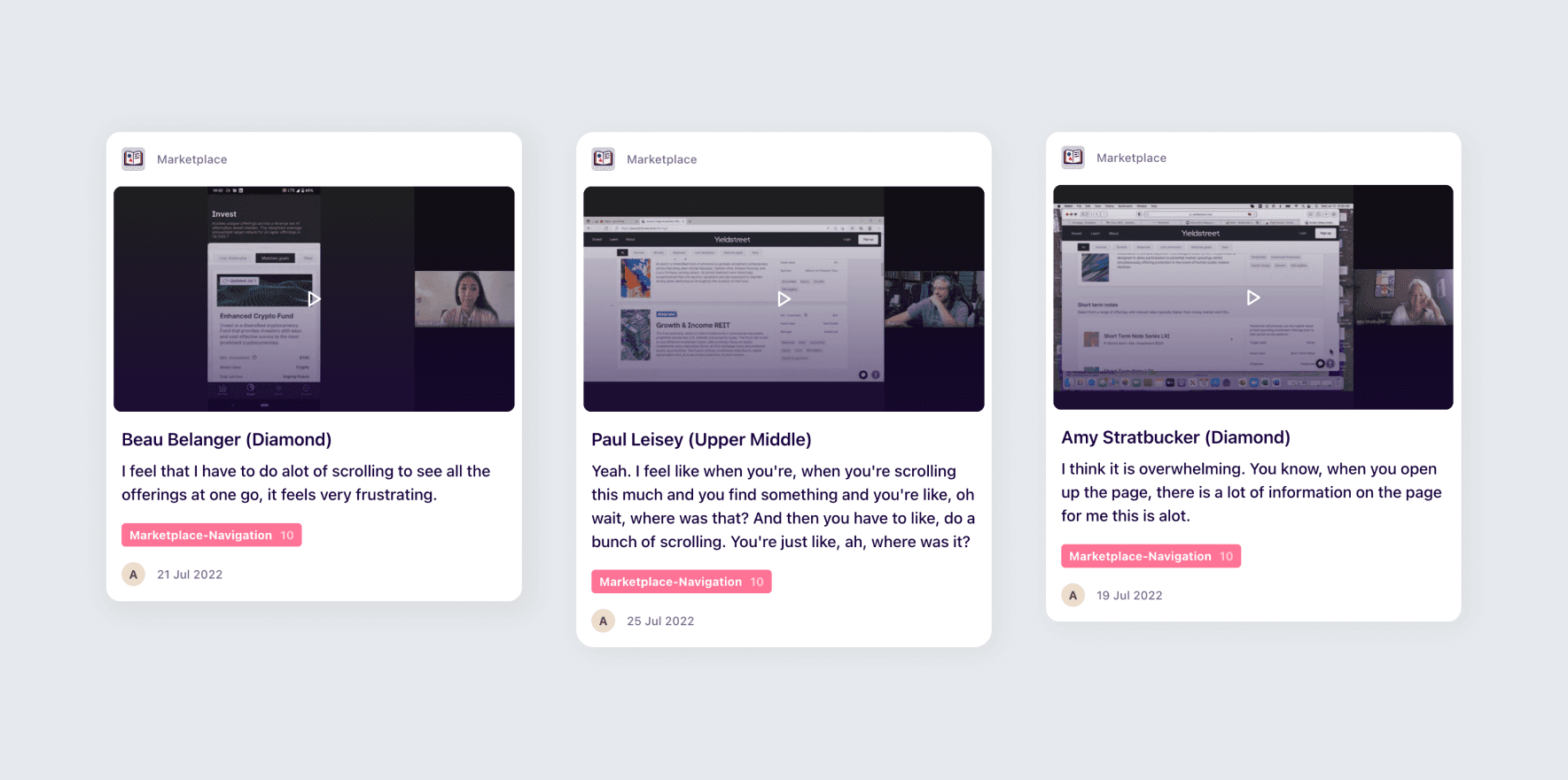 Snapshots of user interviews conducted with some of our investors using Dovetail.