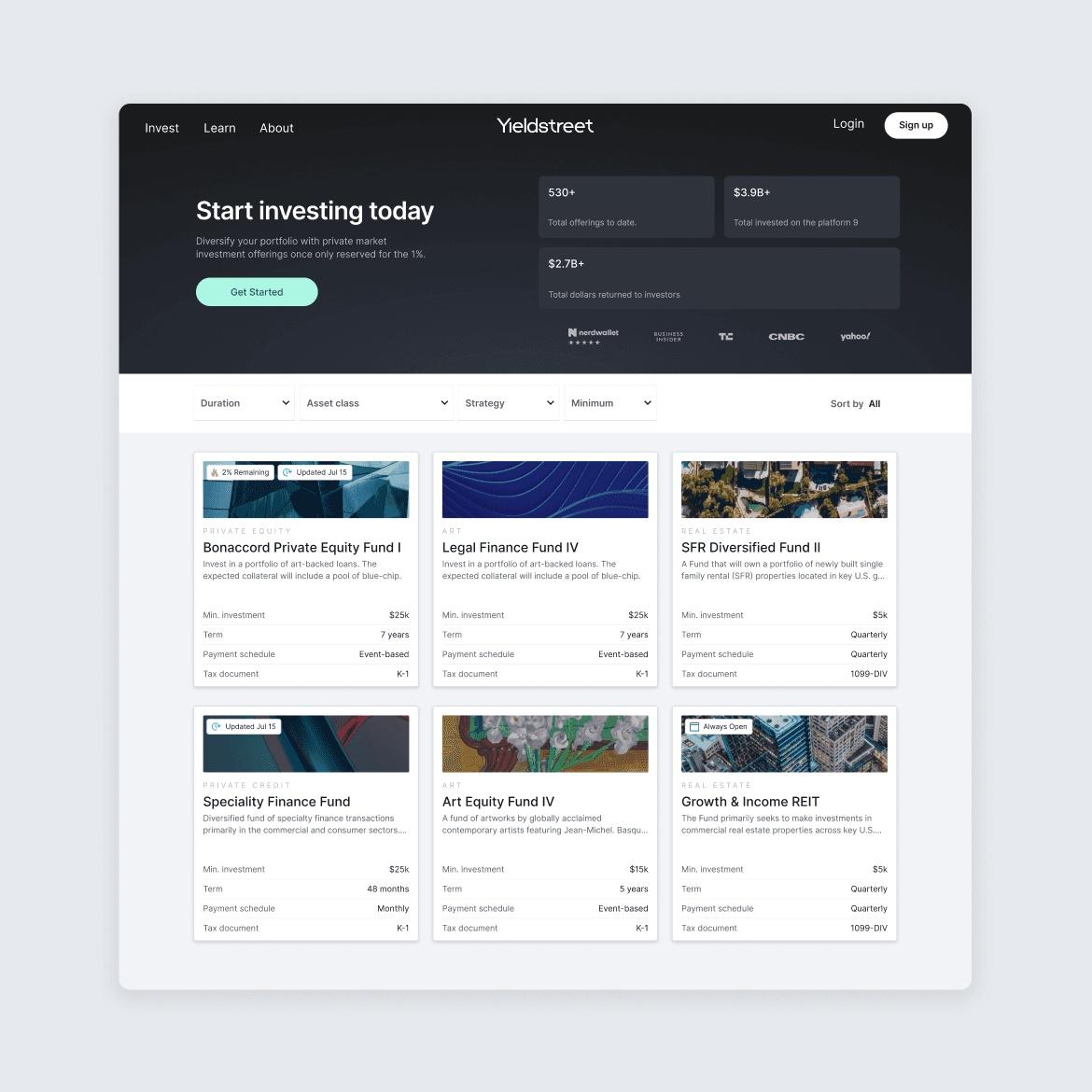 The Yieldstreet marketplace is a crucial part of the platform, acting as the gateway for all investments. At first, it handled a small number of investments efficiently. However, as the platform grew and more investments were added, the marketplace became overwhelmed and started to struggle. Investors reported several issues with the current design, such as a cluttered layout, challenges in comparing investments, and insufficient functionality, among other problems.
