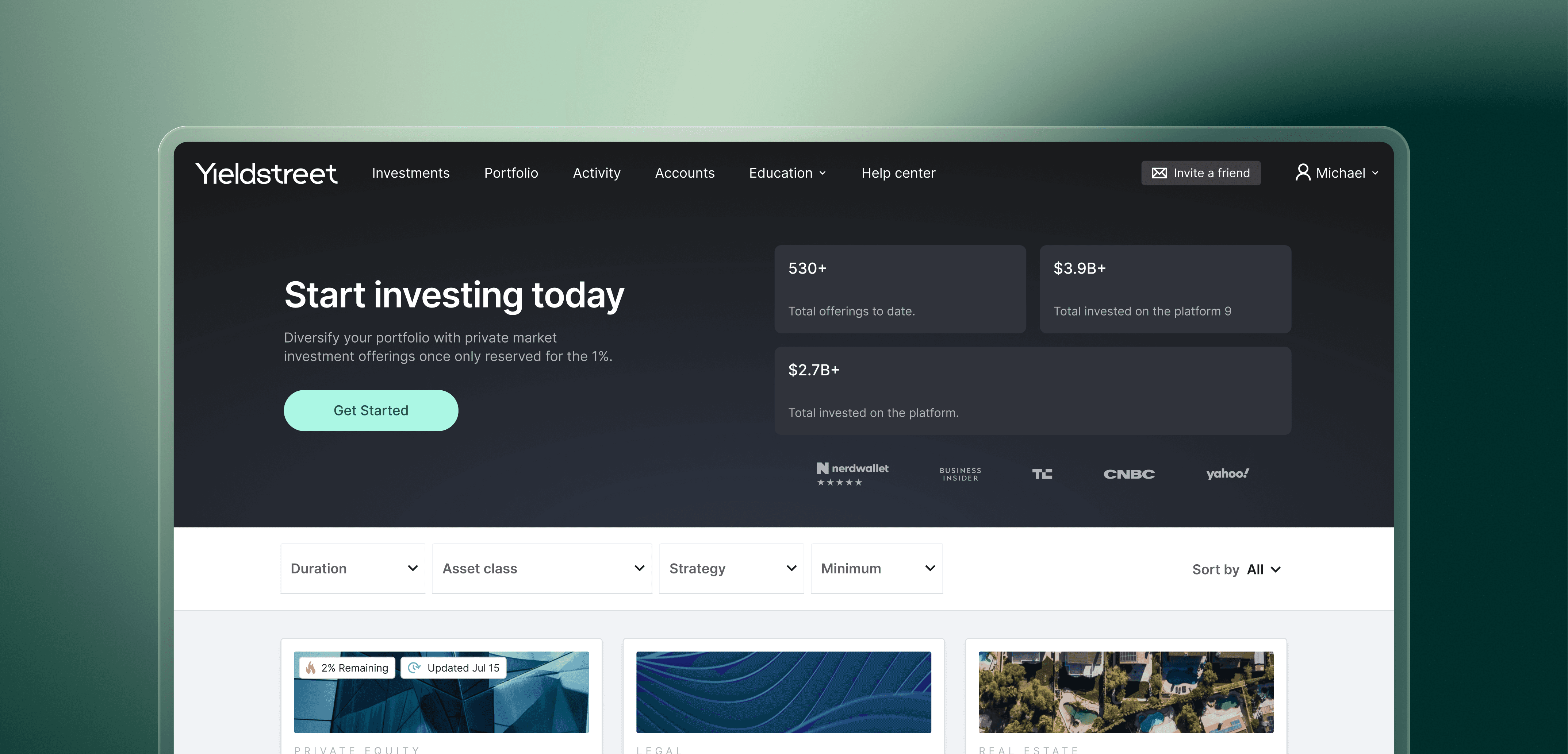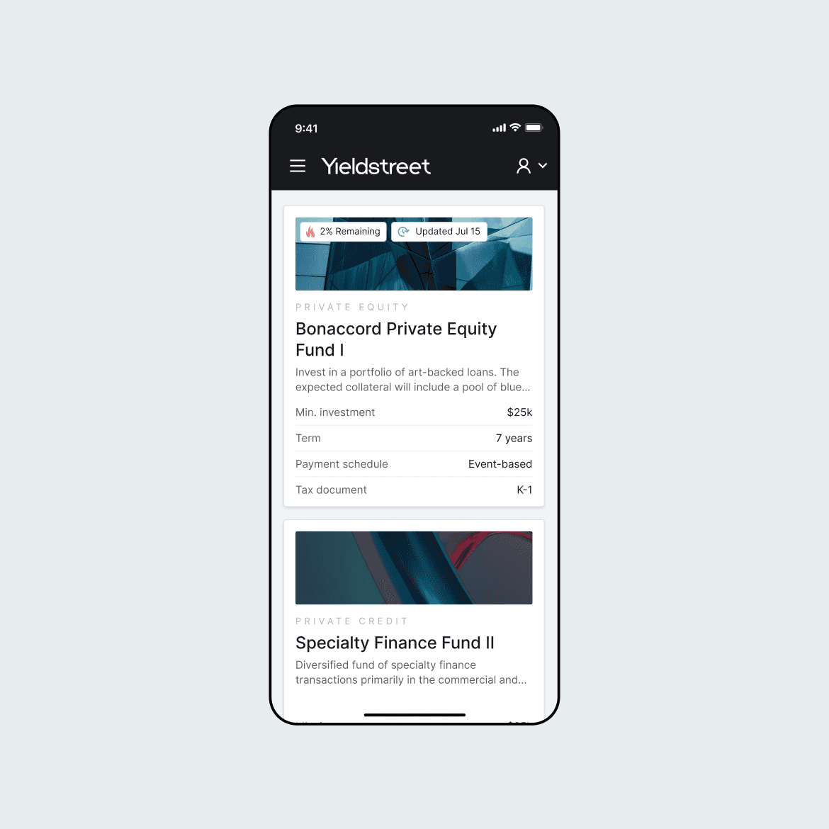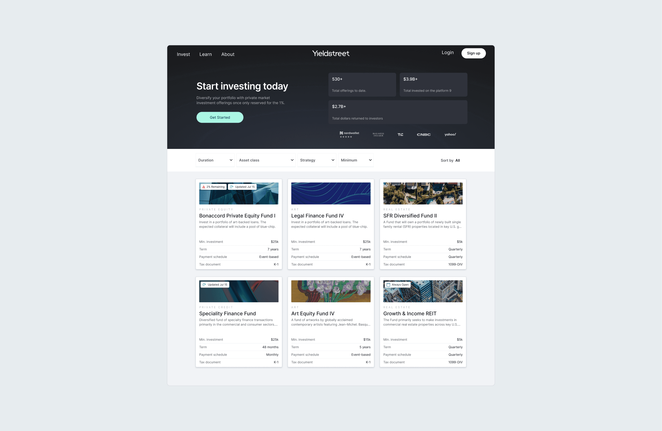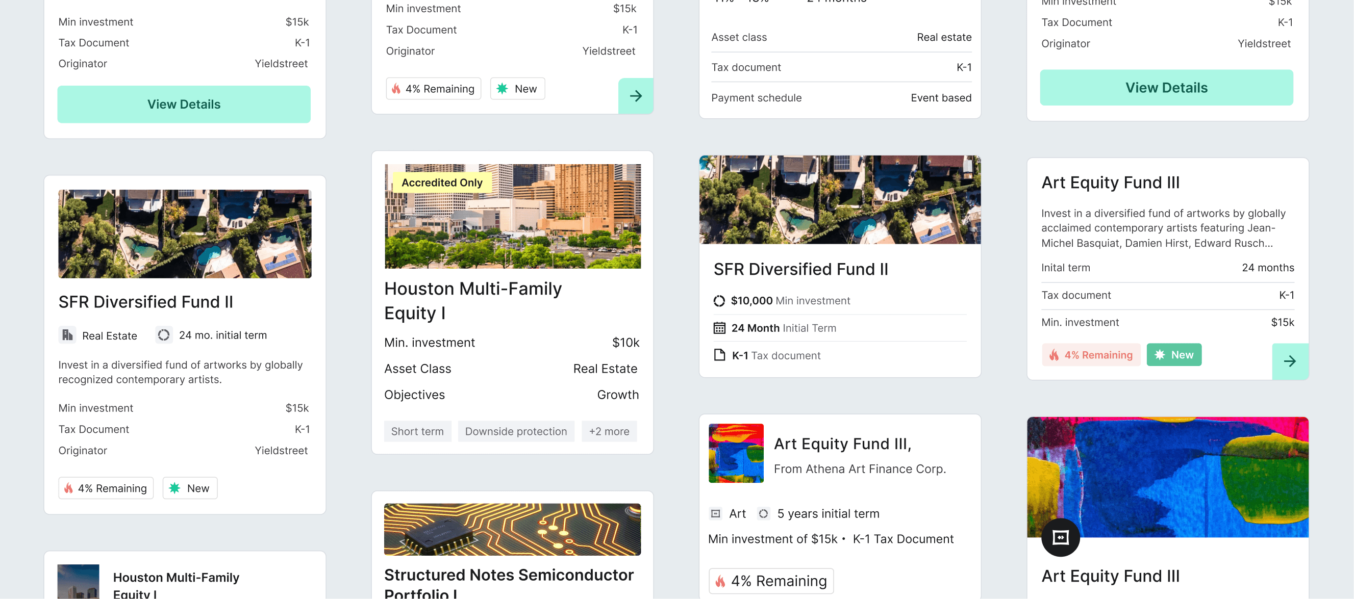 The Yieldstreet marketplace was the central hub where investors discovered, compared, and accessed all available investment offerings. As the platform grew and the number of offerings increased, the original design, built for a much smaller catalogue, started to buckle under the weight.