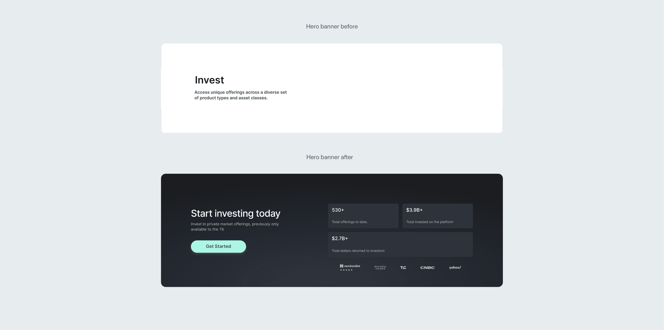 The original hero banner was plain and passive. It failed to communicate the platform's credibility or give new investors a reason to engage. The redesign added social proof, key platform metrics, and clear calls to action. Investors arriving at the marketplace for the first time now see immediately why Yieldstreet is trusted and what they can do.