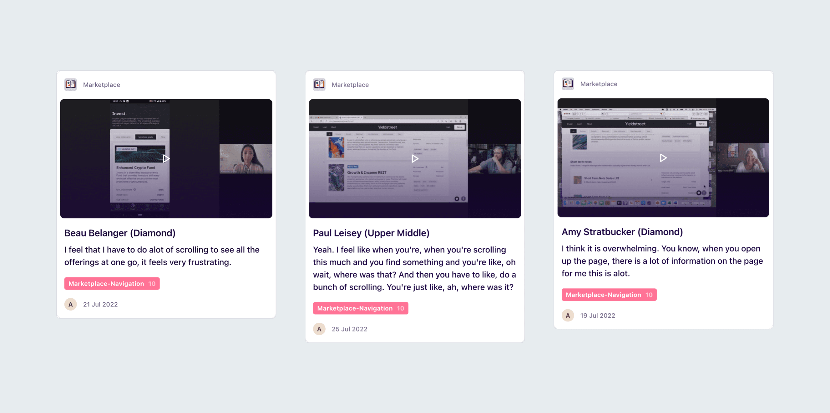 We started with user interviews and usability testing with real investors to understand where the experience was breaking down. The feedback was consistent across sessions: the marketplace had become difficult to use as the volume of offerings grew, and investors were struggling to find and compare what was available.