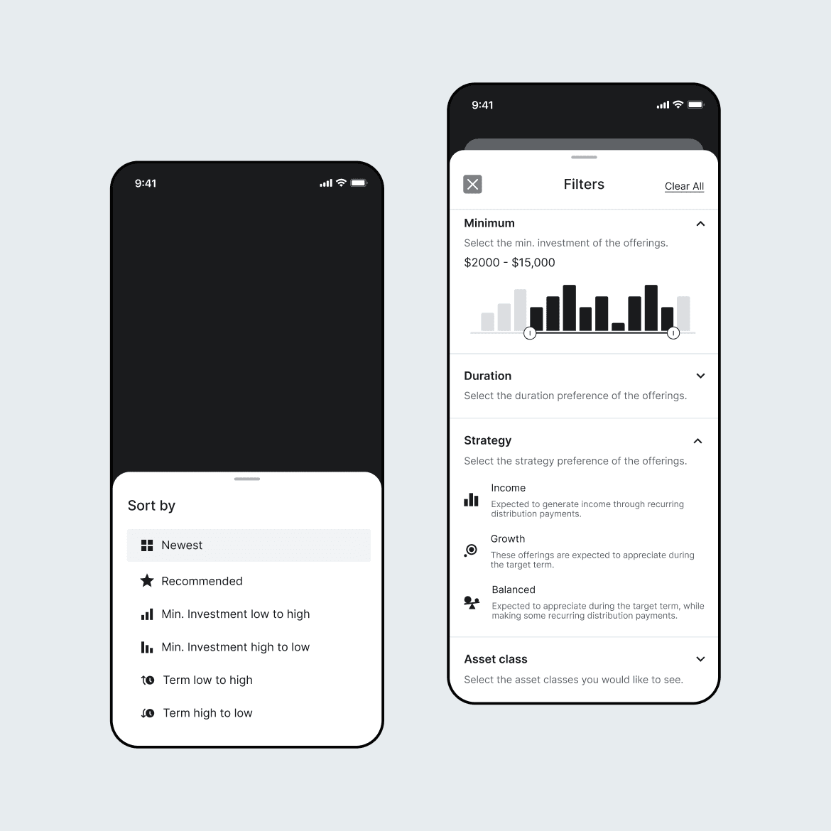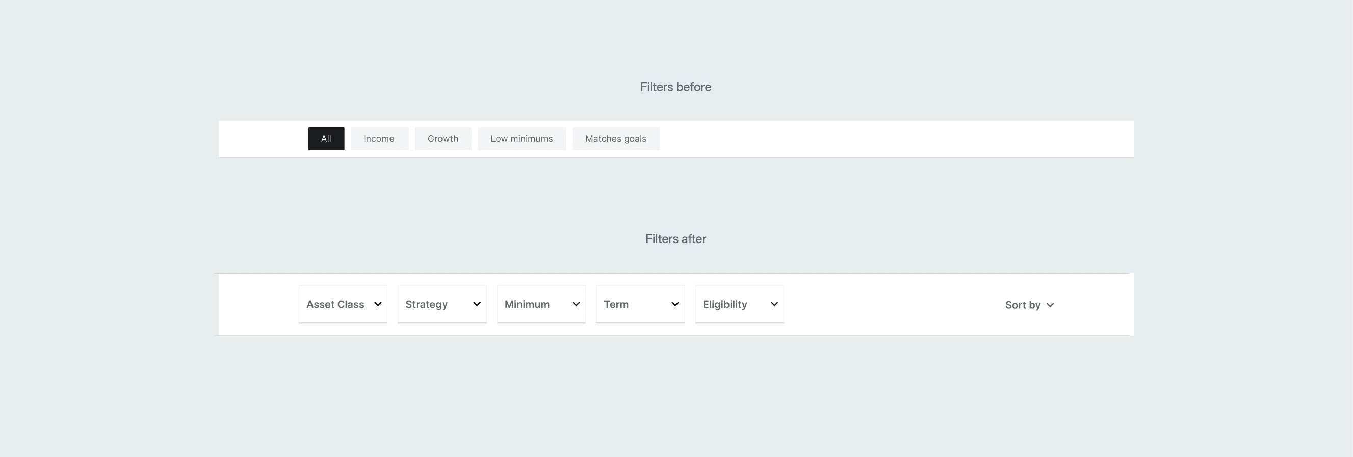The original filter system offered a single option: investment strategy. It was effectively useless for any investor trying to narrow the catalogue by what actually mattered to them. The redesigned filter system introduced asset class, strategy, minimum investment, and term, plus a sort feature for criteria including newest, minimum investment, and term. The 78% increase in filter usage confirmed that investors were looking for exactly this control.