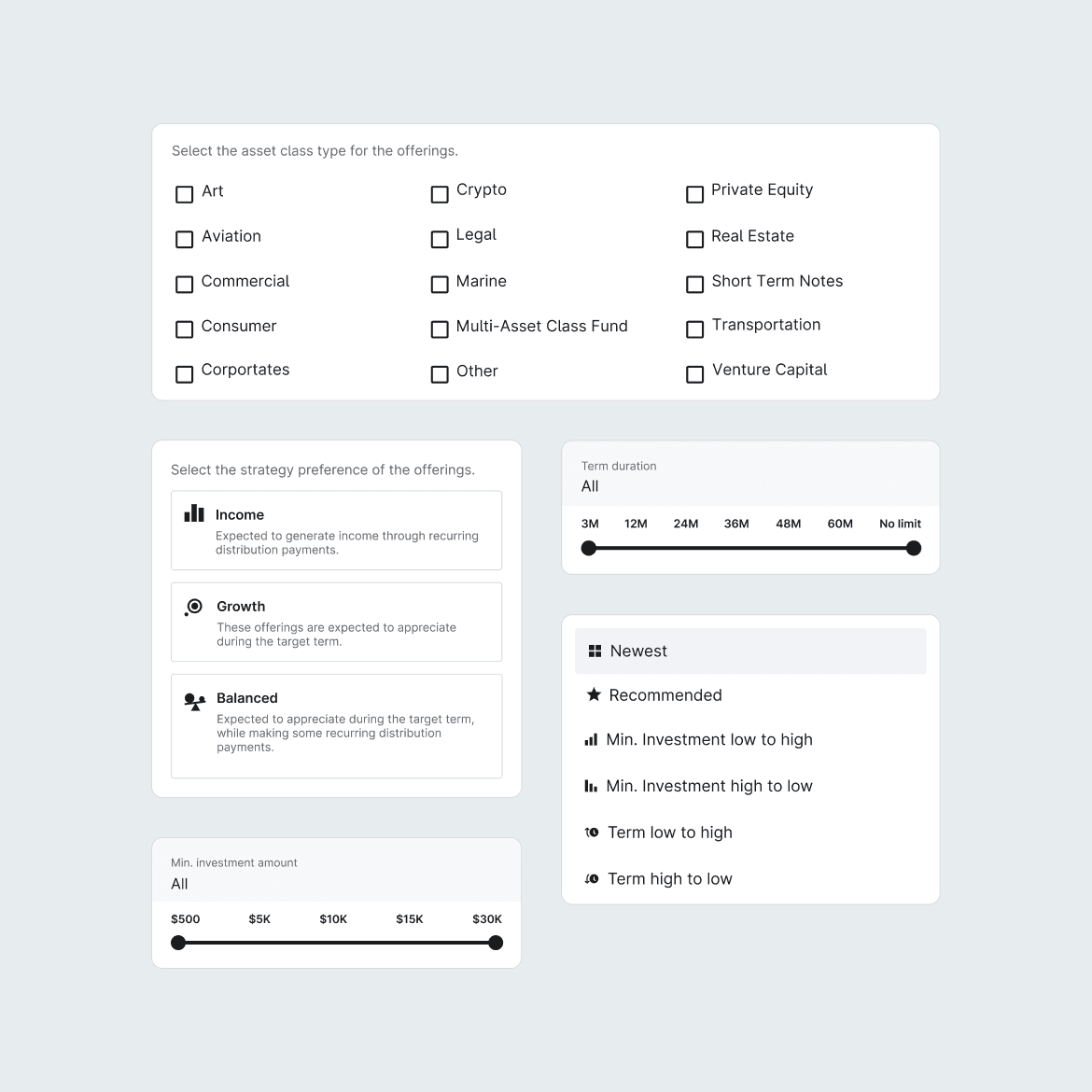 The only filter available was investment strategy. Investors couldn't narrow by asset class, minimum investment, term, or any other criteria they actually used to make decisions.