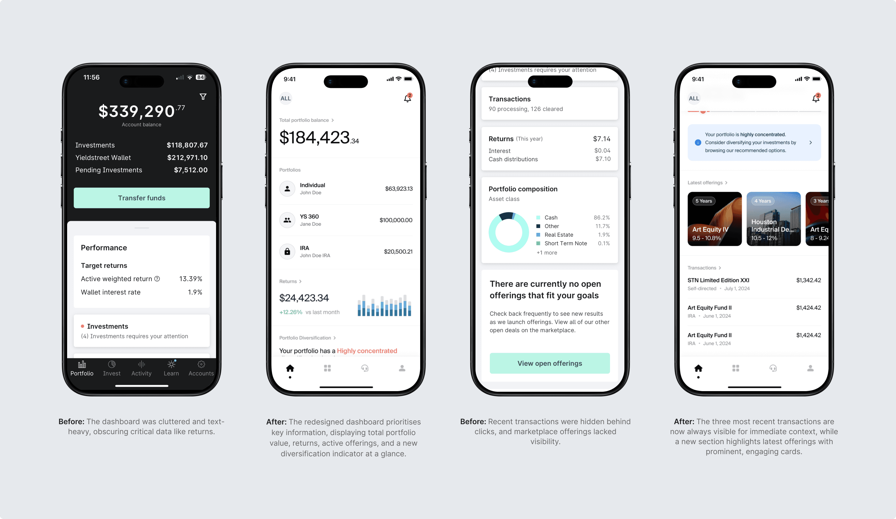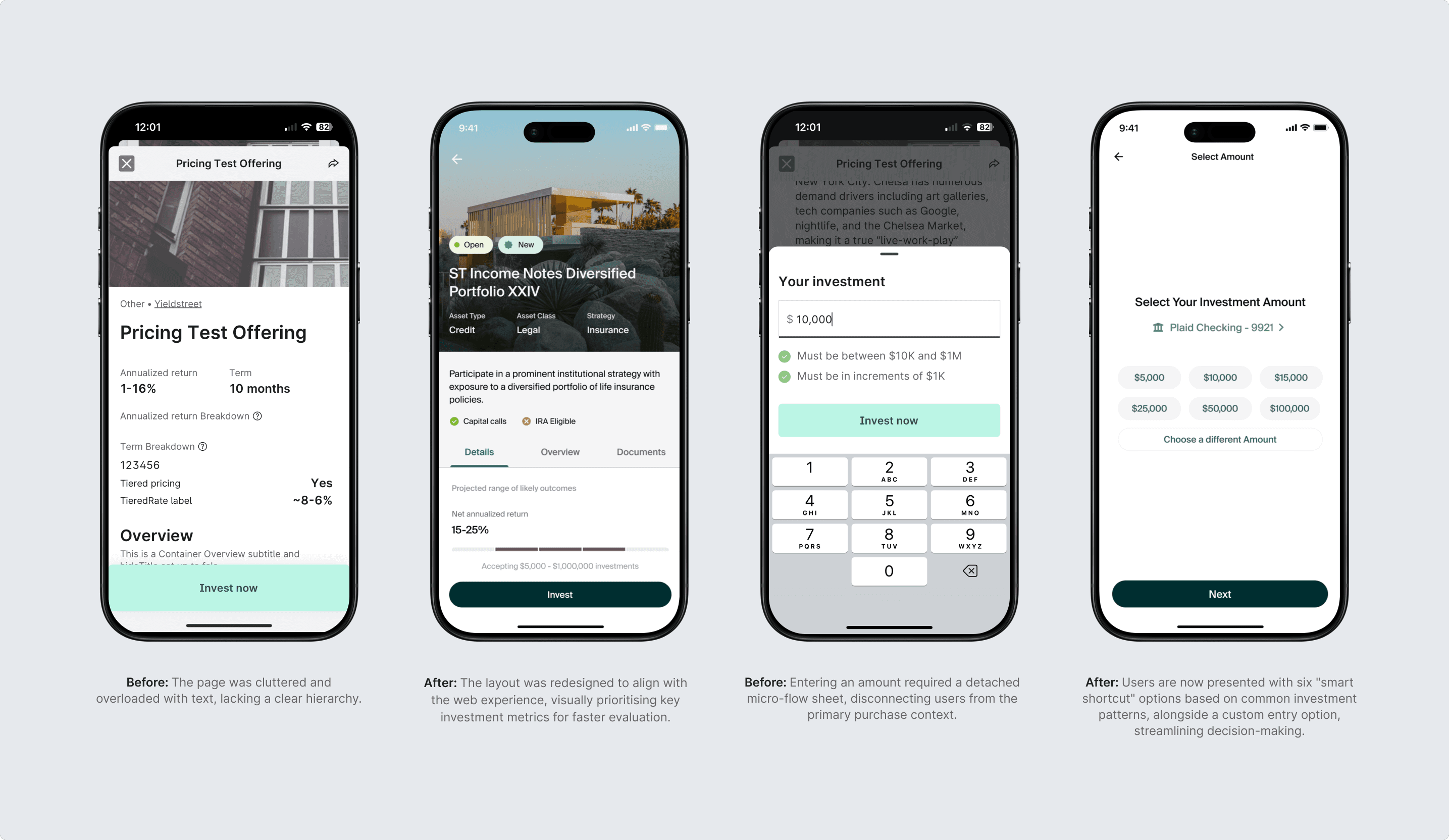 Yieldstreet connects investors with alternative assets, yet the mobile experience lagged behind the web platform. The objective of this project was to address the critical investor pain points to streamline portfolio management and on-the-go investment execution.