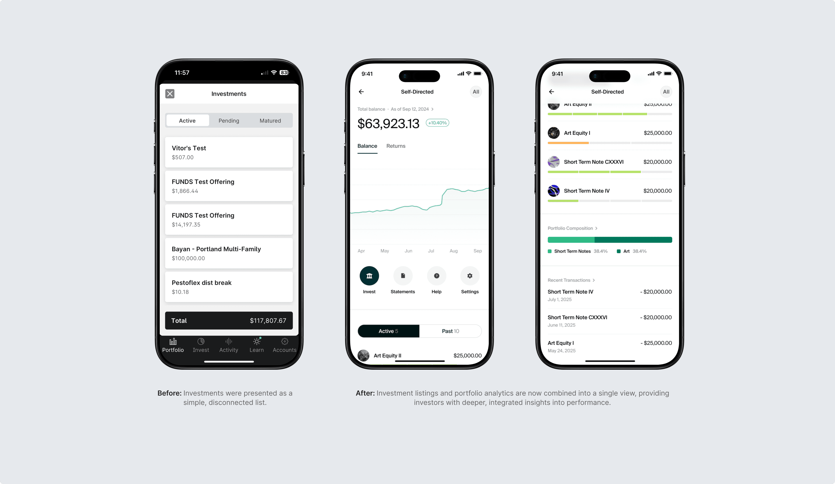 Considering these performance and usability issues, the aim was to re-architect the mobile app for superior speed and unify the design to match the web experience. By doing this, investors will be able to easily and quickly monitor their portfolio and complete investment transactions while on the go. Success is measured by an increase in monthly active user engagement and the mobile investment completion rate.